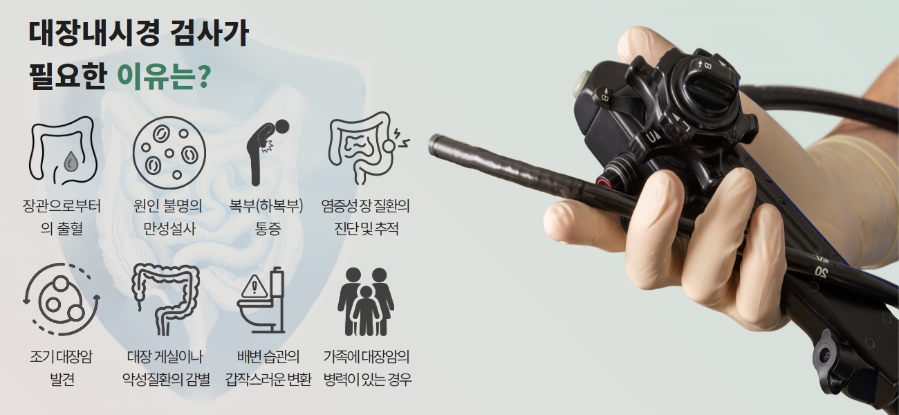 대장내시경 검사는 항문을 통해 항문, 직장, 소장 말단부위를 긴 내시경을 사용해 직접 확인 관찰하는 검사입니다.